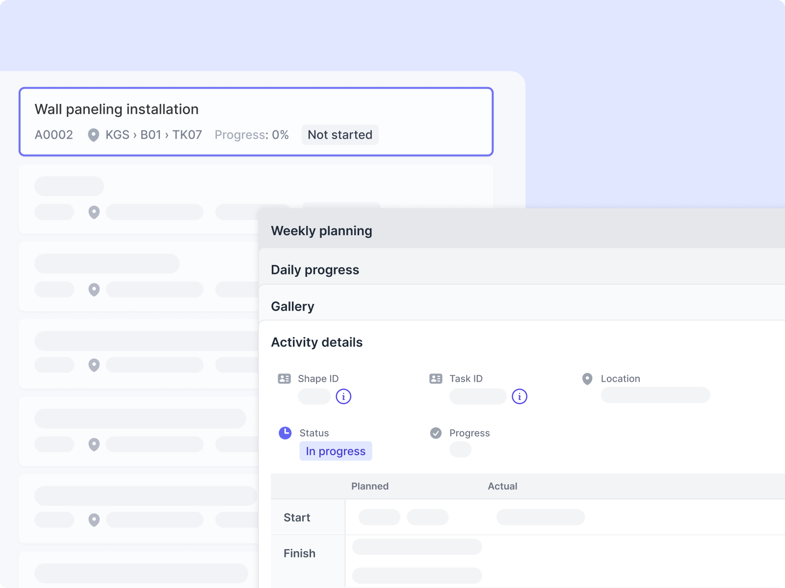 You can drill into any activity to see its complete history: every progress log, every photo, every daily report mention, and every resource allocation over time. It's detailed enough to understand not just how much progress was made, but what it took to get there.